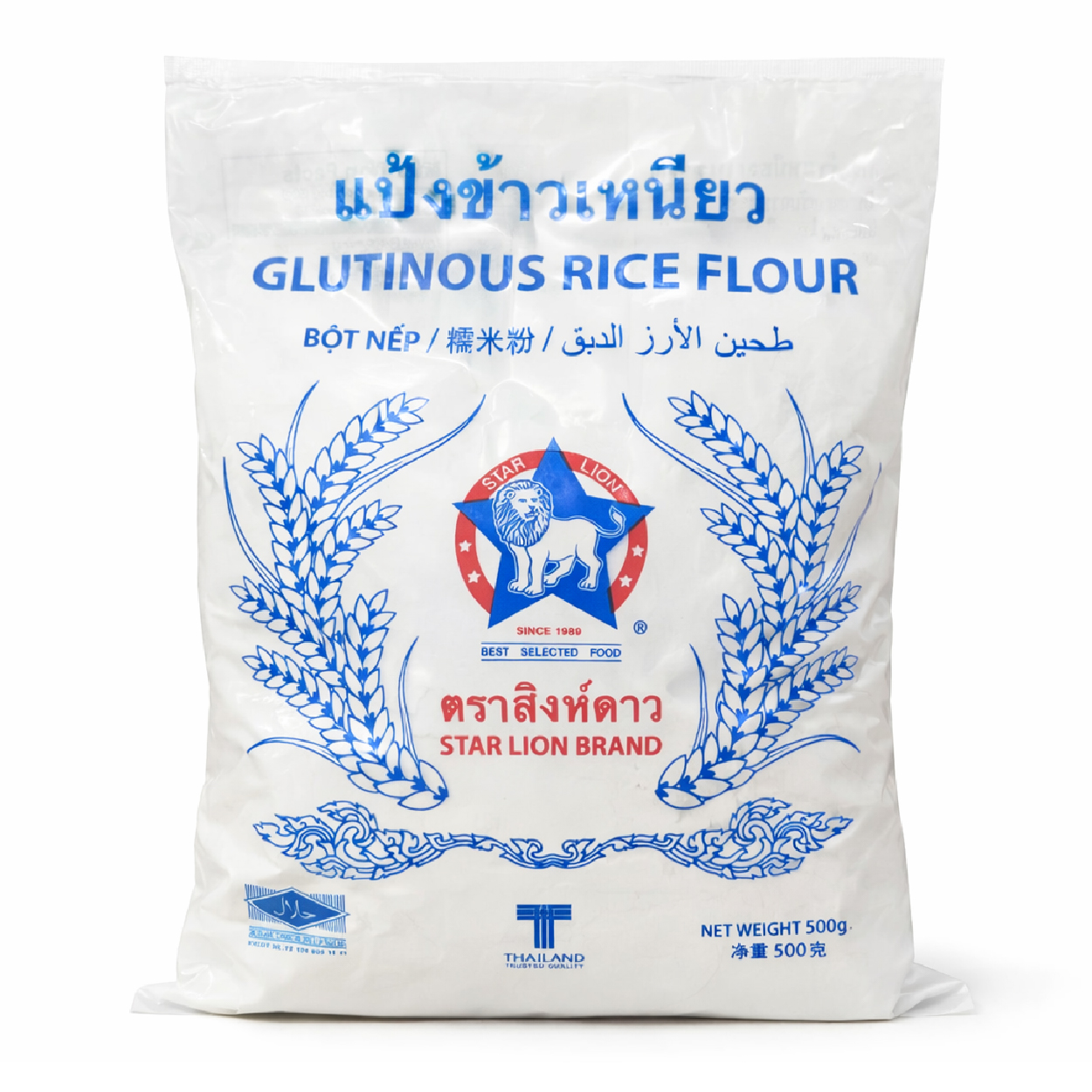 Harina de arroz glutinoso marca Star Lion, ideal para repostería y platillos asiáticos tradicionales como mochi y dumplings. Presentación de 500 g, elaborada en Tailandia con calidad certificada. Sin gluten, textura fina y versátil para cocina dulce o salada.